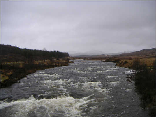Von dort den Hang wieder runter, kam das nächste Ziel, Inveroran an der Victoria Bridge, immer näher. Der Wind ließ im Schutz des Hügels ein wenig nach . Nass blieb es trotzdem. Der „Ort“ Inveroran besteht nur aus einigen Häusern und einem Hotel / Pub. Beides war jetzt leider geschossen. Wanderer in dieser Jahreszeit sollten die Öffnungszeiten telefonisch unbedingt abklären. Mein Zeitplatz von 2003 – 300 m die Straße Richtung Fluß runter – stand fast komplett unter Wasser. Der Fluß hatte ihn fast zur Gänze überschwemmt. Loch Tulla, in das der Fluß mündete, war weit über die Ufer getreten und hatte die Bäche der näheren Umgebung in reißende Flüsse verwandelt. Für den Rückweg entschied ich mich übrigens für die Strasse, die Bridge of Orchy und Inveroran verbindet. Die Strecke ist nicht ganz so aufregend wie über den Berg, dafür aber wesentlich windstiller.