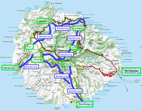 Durch die Passatwinde und -wolken in einen feuchten Norden und einen trockeneren Süden geteilt, lassen sich viele Wanderwege finden, sein ganz individuelles Gomera zu erwandern. Ich bin mit einer organisierten Wandergruppe im September und Oktober 2004 für zwei Wochen über die Insel gewandert. Schöne Winkel, Ausblicke und Kleinigkeiten ließen sich in dieser Zeit entdecken.