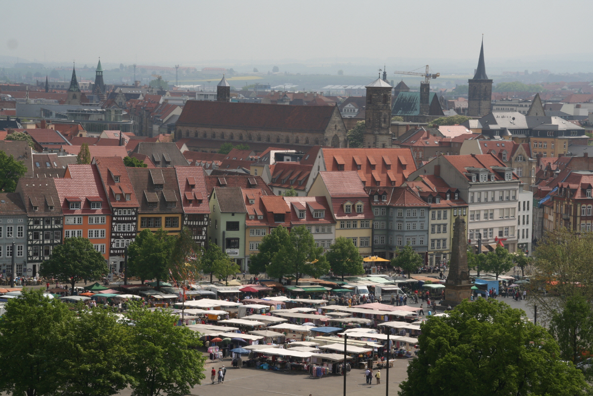 Ansonsten war Erfurt sehr schön. Wir begannen mit dem monumentalen Dom und stiegen dann den Berg zur Zitadelle Petersberg hoch. Leider war es sehr diesig, so dass die Stadt ein wenig im Dunst verschwandt. Unten auf dem Domplatz war Wochenmarkt und von oben konnten wir ganz entspannt das Treiben beobachten, dass von den vielen Menschen ausging.
